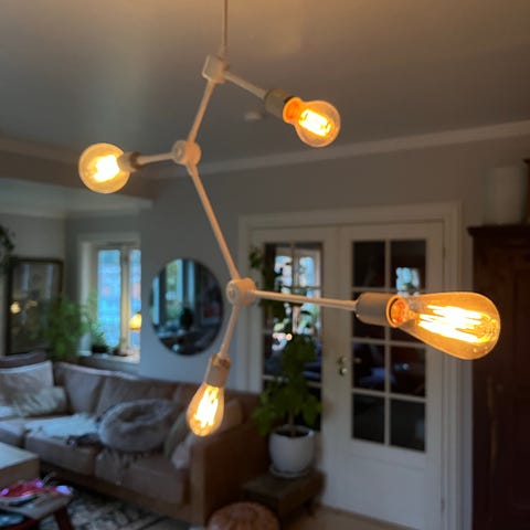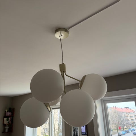 Vurderer å selge denne nydelige taklampen, da den blir litt for stor for vårt rekkehus. Nye dimbare pærer til verdi 750kr kan kjøpes i tillegg til en billig pris .