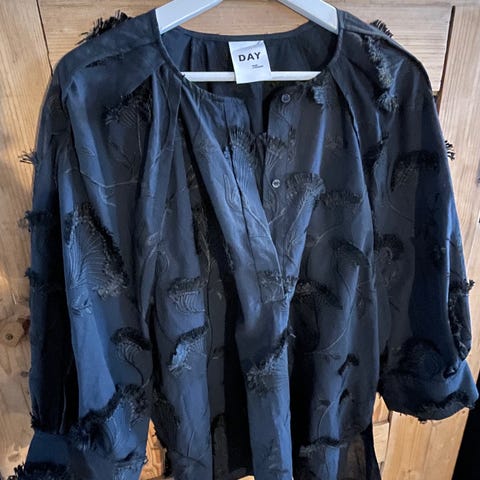 Fabienne Chapot skjorte i blå denim, størrelse M for kvinner. Skjorten har rysjedetaljer på ermene og rund hals med rysjekant. Materialet er denim med små dekorative slitasjedetaljer. Egnet som overdel til hverdagsbruk og pent. Nydelig myk kvalitet.