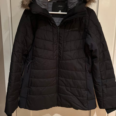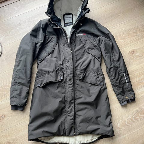 « Didriksons»i blå farge, størrelse 40 for kvinner. Jakken har hette med avtagbar pelskant og justerbare detaljer. Egnet for utendørs bruk som beskyttelse mot vær og vind. - god vinterjakke og sure kalde høstdager .- ( se bilder) - sender gjerne med Posten Bring ! - ikke med fiks ferdig!