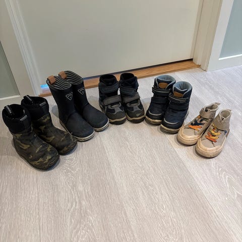 Bruken har vært i varierende grad. Noen godt brukt, andre ikke. Selges samlet for kr 350. Converse str 26, Ecco vintersko str 26, Bruse vinterstøvel str 26, Vikin støvel str 26, H&M sommersko str 29 og Viking vinterstøvel str 29.