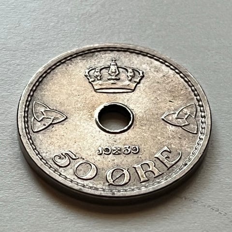 Norsk 50 Øre mynt fra 1945 Laget av zink rund form, standard myntstørrelse. Mynten har tradisjonelt design med årstall.