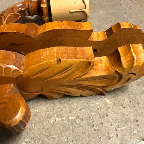 Et par vel fungerende vintage vegglamper i tre med flott englemotiv. Lampene har har nærmest intarsia i den blanke bakplaten, se bilder. Kommer med et par hele og pene skjermer på tross av alder. Lampene er ikke nye, men kjenner ikke til alder, muligens fra 50 - 60 tallet, uten å kunne dokumentere dette.