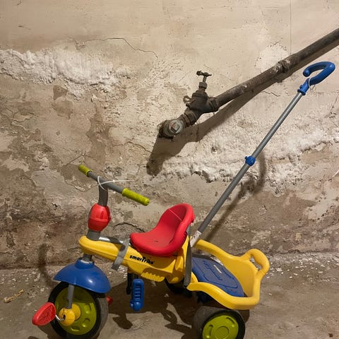 Barnetråsykkel med skyvestang i fargene rød og gul. Utstyrt med tre hjul for stabilitet og et sete med ryggstøtte. Skyvestangen gjør det mulig for voksne å hjelpe barnet med styring og bevegelse. Passer for små barn som lærer å sykle.