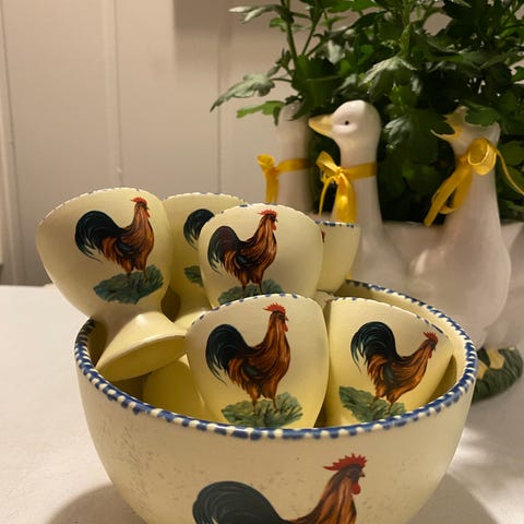 Koselig sett bestående av bolle, krus og eggeglass, alle med motiv av en hane. Produktene er laget i keramikk med en kremhvit base og blå kantdetaljer. Jeg betaler frakt. 😊