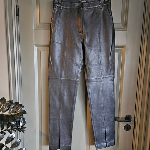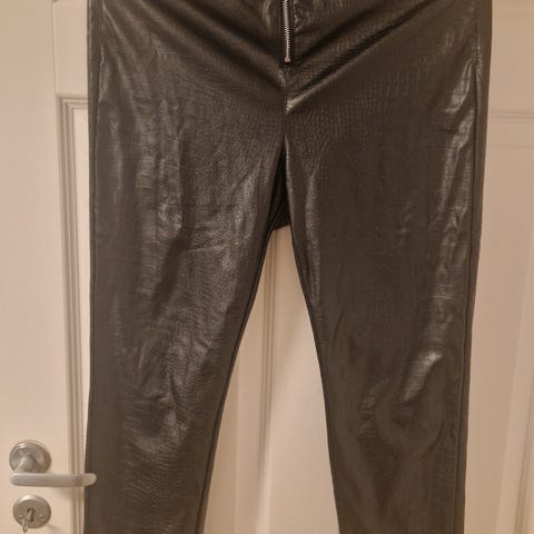 Donna bukser i svart farge, størrelse 42 for kvinner. Laget i et materiale som etterligner skinn med glidelåsdetaljer ved bena. Designet for damebruk med elastisk midje for komfort. Glidelås i siden. Flosset innside som gjør at den føles god på. Størrelseslapp er klipt bort, men det er en str 42.