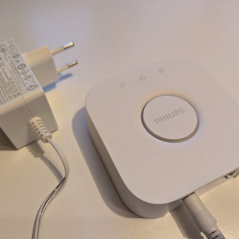 Philips Hue Bridge selges, modell 3241312018A. Støtter 50 lamper og 12 kontrollere. Leveres med 5V strømforsyning.