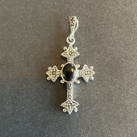 Pent brukt anheng i sølv med alv. 25 mm høyt og 14 mm bredt. Stemplet med 925 for sterlingsølv bak.