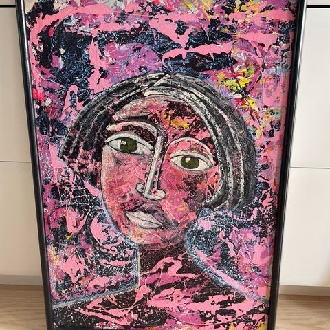 Farget tegning av et portrett med abstrakte og fargerike bakgrunnselementer. Kunstverket er innrammet med en svart ramme og hvit passepartout. Passer til veggdekorasjon i hjem eller kontor.