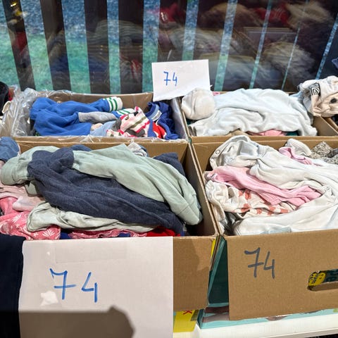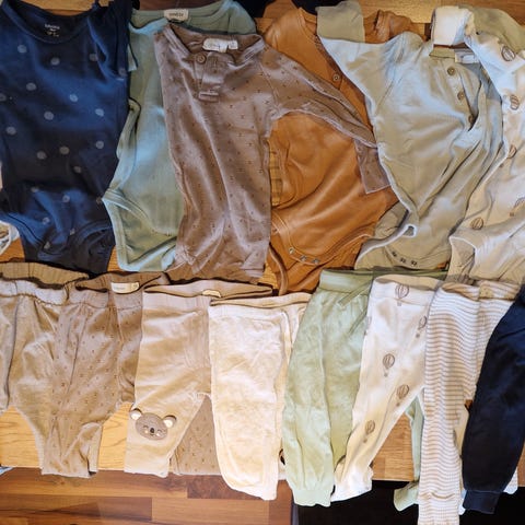 13 bukser og 7 bodyer, samt 7 par sokker.