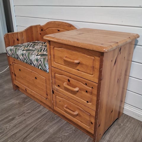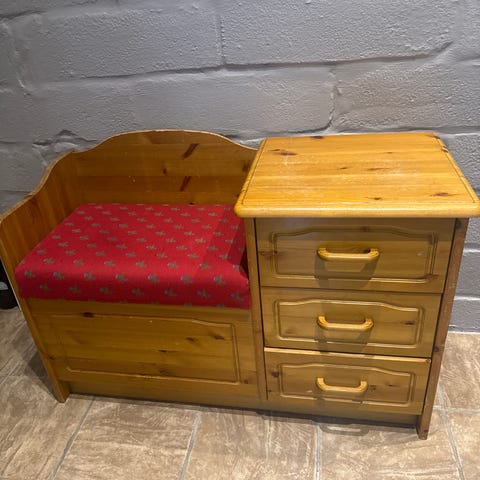 Kult gangmøbel med sittepute i skinn/skai. Noen bruksmerker, men skuffer går greit.