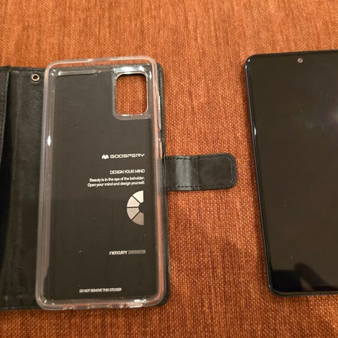 Samsung Galaxy A51 mobiltelefon med 128 GB lagringskapasitet i svart farge. Enhetens skjerm og ytre er synlig i bildene, og den leveres med original emballasje og tilbehør. Telefonen kjører Android operativsystem og har en stor skjerm som vises i oppstartsbilde.