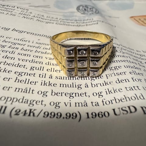 Selger en flott herremodell ring i gult gull med tre diamanter.