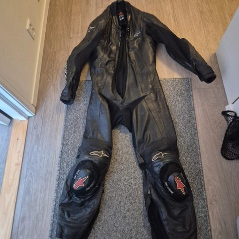 Skinnjakke fra toppmerke Dainese i str 50 selges billig, fin patina, jevnlig smørt med skinnbalsam.