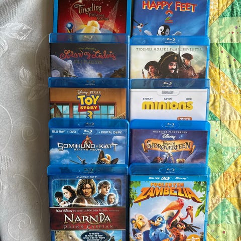 Samling av Disney Blu-ray filmer inkludert titler som Løvenes Konge, Narnia, Aladdin, Prinsesse og andre. Filmer i standard Blu-ray format, egnet for familier og barn.