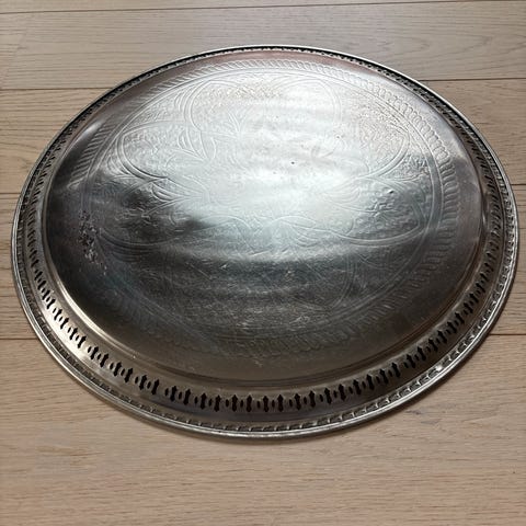 Sølvplett Bordskåner Gryteunderlag Kjeleunderlag . Kasserolle underlag. Kokekar underlag. Gryte brikke. Flaskeunderlag. 19,6 cm i diameter Vinflaske coaster. Det mørke på kantene er lampe taket.