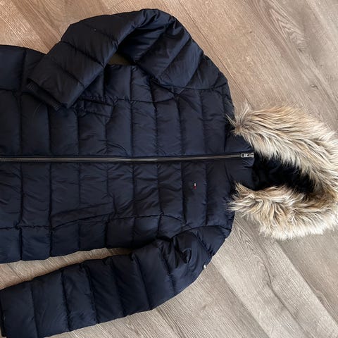 Dunjakke med avtagbar pels fra Tommy Hillfiger selges 800,- Den er merket med str M, men tilsvarer mer en S.