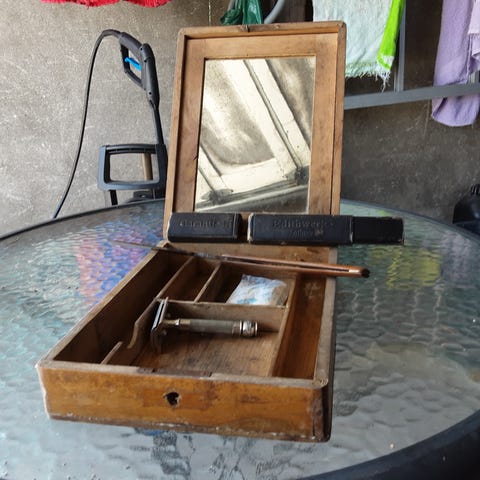 Fint skrin med diverse gamle barbersaker selges samlet.