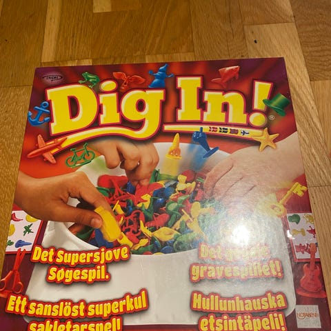 Dig In! er et brettspill for familiebruk. Spillet inneholder fargerike plastfigurer og krever at spillere bruker finmotorikk for å fjerne gjenstander uten å forstyrre andre. Passer for barn og voksne, og fremmer samarbeid og presisjon. Inneholder spilleregler og komponenter som vist på emballasjen.