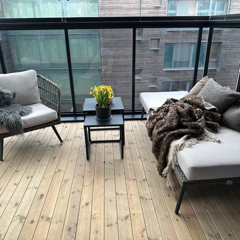 Sofaen har avtagbare puter og er egnet for utendørs bruk på terrasse eller balkong.