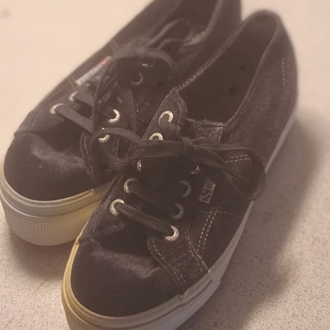 Lite brukt superga sko, ekstra høy hæl. De er litt støvete men ellers er de pent brukt, finner ingen anmerkninger.