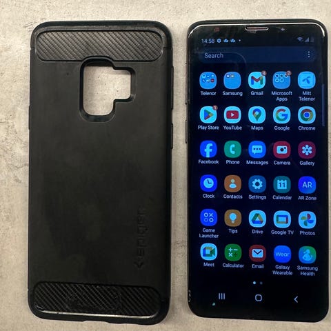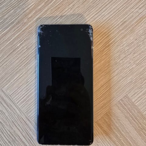 Samsung Galaxy S19 mobiltelefon med 64 GB lagringskapasitet i svart farge. Telefonen har en stor skjerm som dekker nesten hele fronten og en bakside med kamera og Samsung-logo. Passer til bruk som smarttelefon med lagringsplass for apper, bilder og data. Den er låst og vi har glømt koden.