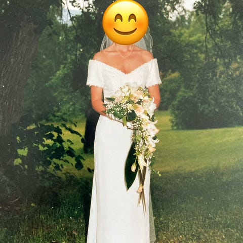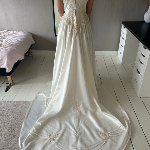 Selger en vakker, skreddersydd brudekjole fra 1998 i klassisk og tidløs design.