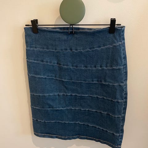Floyd denimskjørt i blå farge, størrelse M. Skjørtet har en tettsittende passform med horisontale sømmer og glidelås bak.