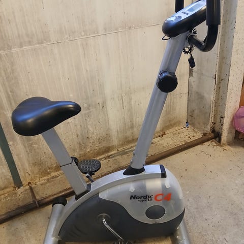 Body Sculpture RC5350 ergometersykkel i sølvfarge. Treningssykkel med justerbart sete og håndtak, pedal med reimer for sikker fotplassering, og digital skjerm som viser treningsinformasjon. Egnet for innendørs kondisjonstrening.