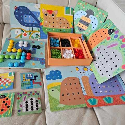 Mosaic toy with different color pegs. Comes with 6 pictures to match the colors with and other image ideas for kids to copy on their own.