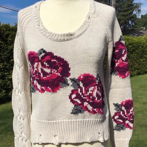 Beige i bunn med litt svart. V hals og lang arm.