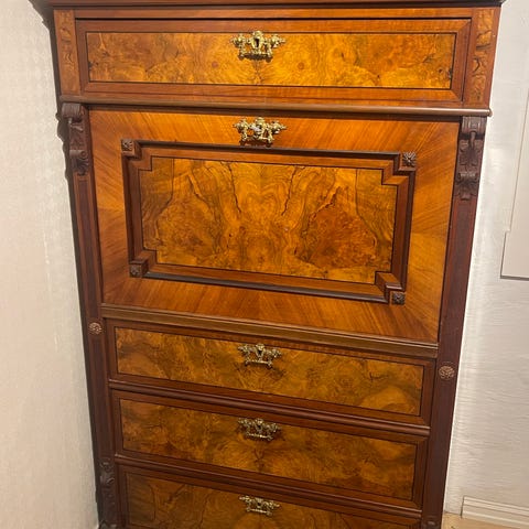 Antikk skap i tre med hyller og skuff