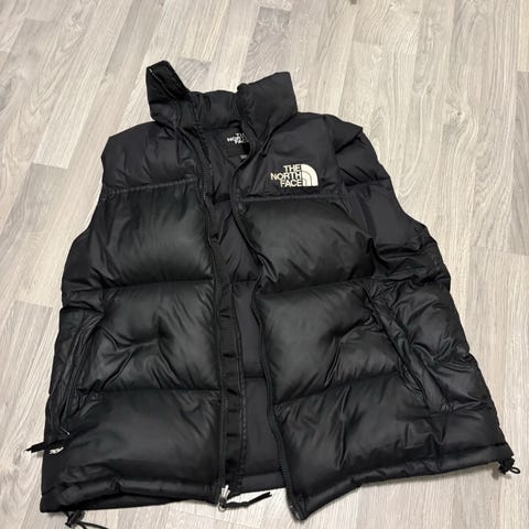The North Face herrevest i størrelse L, farge svart. Vesten er polstret med 700-fill dun for isolasjon og varme. Den har glidelåslommer(1stk inne)+ute på begge sidene. Reklame for JD Honney forran og bak i gult.