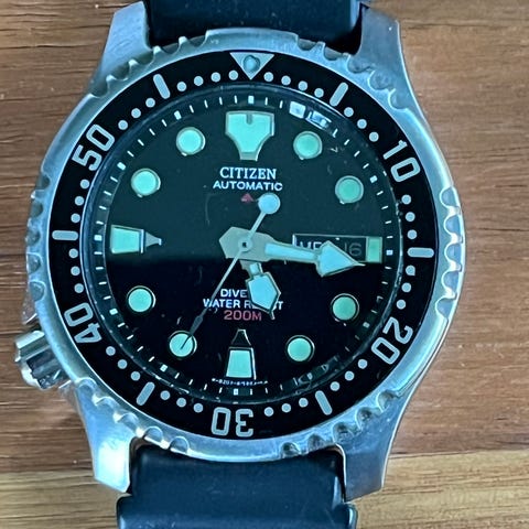 Denne klokken er designet og produsert av den tradisjonsrike klokkefabrikanten Citizen, og er fra deres meget populære Citizen Promaster kolleksjon, som inkluderer noen av markedets beste og mest populære dykkeklokker. Klokken er ca fem år gammel og fremstår som nesten ubrukt. Nypris 10999,- Klokken er i original forpakning.