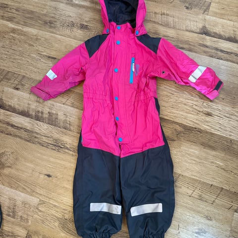 Vindtett og vannavvisende. Avtagbar hette. Begge fotstrikkene er intakte.