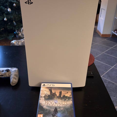 Sony PlayStation 5 spillkonsoll med én trådløs kontroll og hodetelefoner.