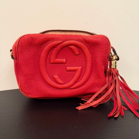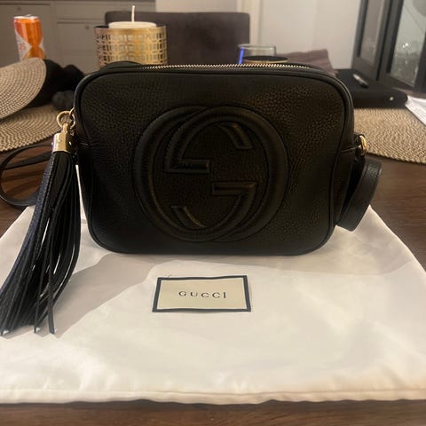 Vurderer å selge min sorte Gucci Soho Disco Bag. Kjøpt hos Gucci i Oslo i 2018. Denne modellen selges ikke lengre. Har kvittering og dustbag og eske følger med. Vesken og skinnet er i fin stand, men har blitt slitt i de øvre kantene på baksiden, se bilde. Innvendig ser man også at den er brukt. Selger den derfor billig, 5000kr.