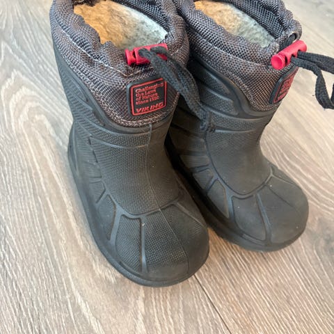 Viking unisex vinterstøvler i størrelse 25. Støvlene er svarte med borrelåslukking og har en isolert innside for varme. Yttersålen har godt mønster for grep. Materialet er slitesterkt og egnet for kalde og våte forhold.