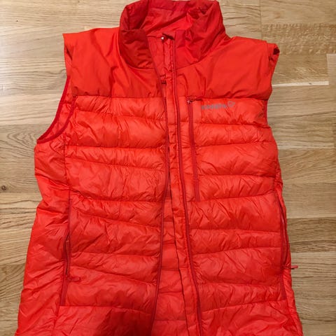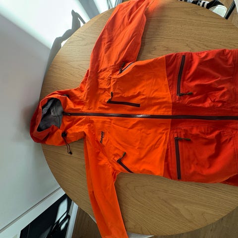 Bergans jakke for menn i størrelse M, farge blå. Jakken er designet for utendørs bruk med funksjonelle detaljer som hette, glidelåser og lommer. Materialet er tilpasset for å gi beskyttelse mot vær og vind. Snølås i jakke rundt midje er borte, ble ikke brukt.