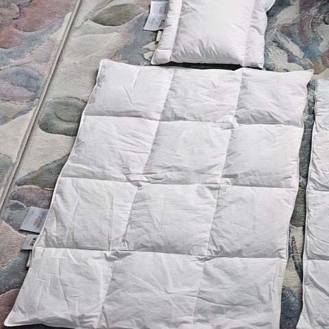 Alvøya dundyne str 65*80 cm og Alvøy dunpute str 35*40 cm til baby. Lite brukt. Er en liten flekk på ene hjørnet av puta, har prøvd å vaske den vekk med sitronsåpe og i vaskemaskin uten hell, har ingen betydning for bruken. Nyvasket og tørketromlet.