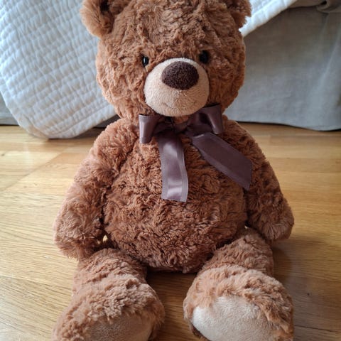 Teddykompaniet barneleke i form av en bamse med blå kropp og rød sløyfe. Leken er laget av mykt materiale og passer for små barn. Med rangle inni.