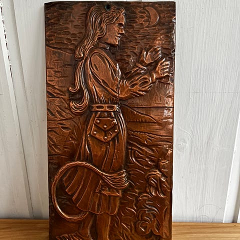 Et lite kobberrelieff med tradisjonelt trollmotiv. Presset kobberblikk med filtkledd treplate og oppheng.