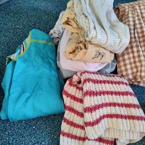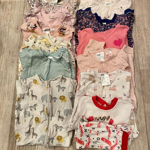 Stor klespakke selges str 74, 80 og 86. Mye bomull. Noe ull og annet materiale.