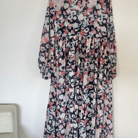 Bik Bok hverdagskjole i størrelse XS, svart med rosa blomsterprint. Kjolen har lange ermer og belte i livet. Laget for kvinner.