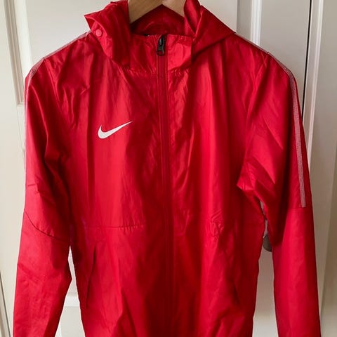 Nike Dri-Fit fotballjakke for barn i størrelse 146. Jakken er blå med hvite detaljer på sidene og laget av fukttransporterende materiale. Designet for bruk i fotball og andre sportsaktiviteter.