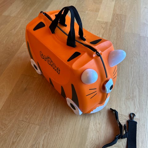Barnet synes det er stas å trekke kofferten etter seg, eller å sitte oppå å sparke seg bortover. Eller så kan foreldrene dra barnet med barnet sittende på kofferten.