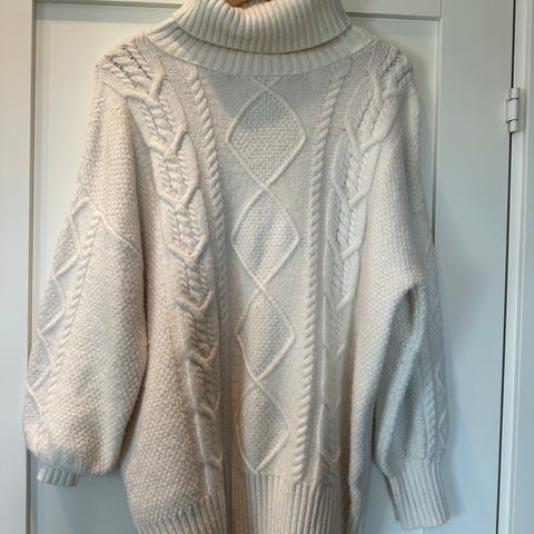 Nydelig naturhvit høyhalset genser med flettemønster foran. Klør ikke. Ikke vasket.