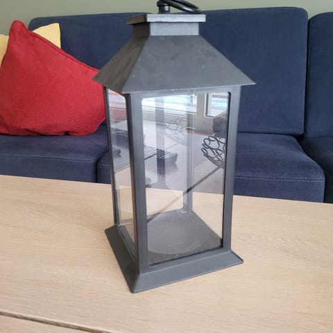 Ukjent Merke bordlampe med metallramme og glasspaneler. Lampen er hvit med sølvfarget metalltopplokk og har en hengende krok på toppen. Passer til bruk som dekorativ bordlampe innendørs..