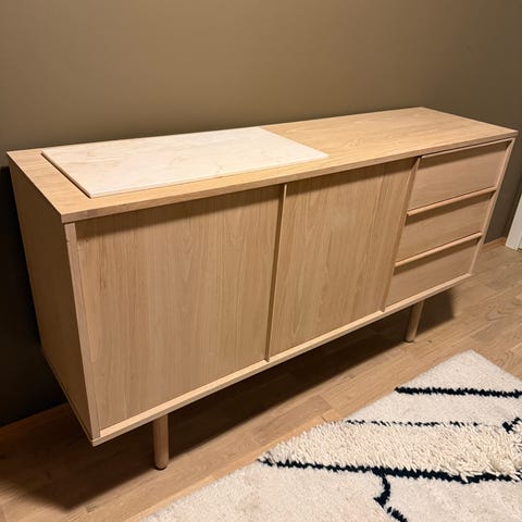Vært et favorittmøbel her i huset, da den har mye lagringsplass i seg, samtidig som at den er et fint møbel. Små bruksmerker på to hjørner som lett kan fikses med lakk.