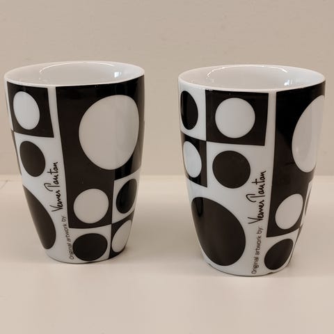 To asjetter og to eggeglass fra Menu. Design Pernille Vea. Dekor Vernon Panton. Sort dekor på hvit bunn.