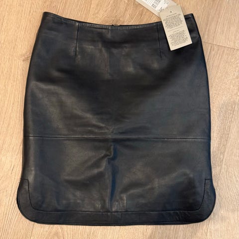 Part Two skinnskjørt i svart farge, størrelse 44 for kvinner. Skjørtet er laget av 90% skinn og 10% polyuretan, med fôr i 100% polyester. Produktet har glidelås bak. Skjørtet er aldri brukt.